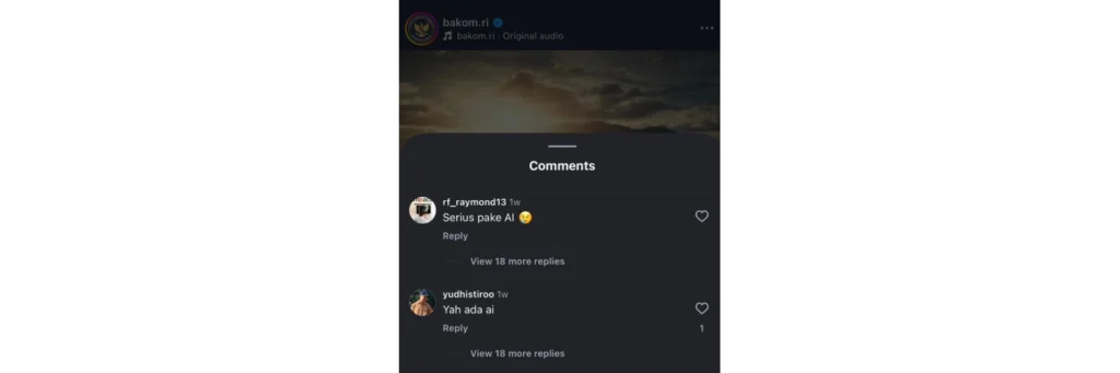 Tak butuh waktu lama, kolom komentar di unggahan Instagram tersebut ramai dengan dugaan video itu dibuat oleh kecerdasan buatan (AI). Beberapa pengguna Instagram menulis, “Serius pake AI” dan “Yah ada ai”.