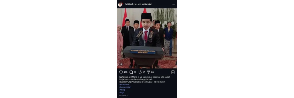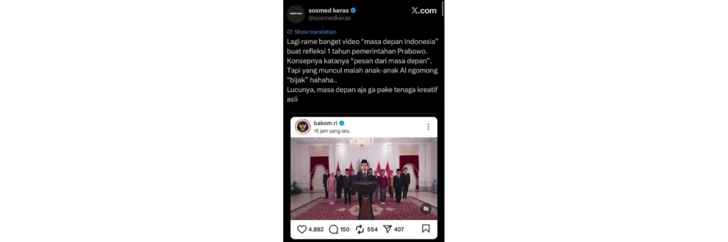 “Lagi rame banget video ‘masa depan Indonesia’ buat refleksi 1 tahun pemerintahan Prabowo. Konsepnya katanya ‘pesan dari masa depan’. Tapi yang muncul malah anak-anak AI ngomong bijak hahaha. Lucunya, masa depan aja gak pake tenaga kreatif asli.”