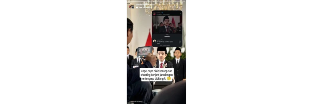 Klarifikasi tim produksi video peringatan setahun pemerintahan Prabowo. (Tangkapan layar: Instagram Story/@devielvaraa).