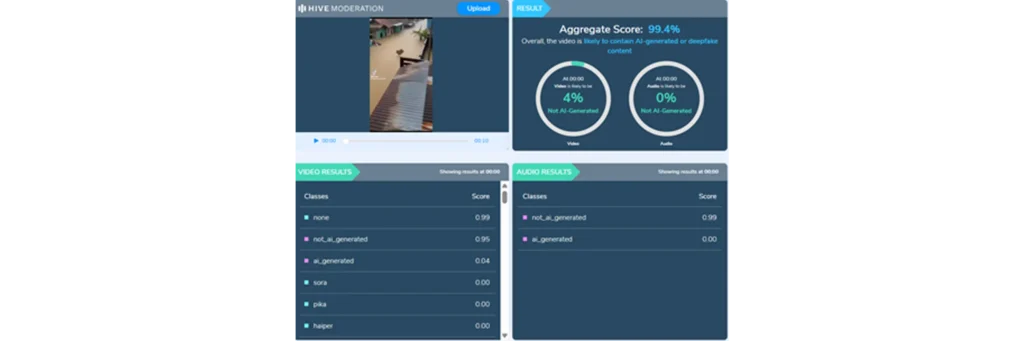 Tangkapan layar hasil analisis konten video viral. (Sumber: Hive Moderation).
