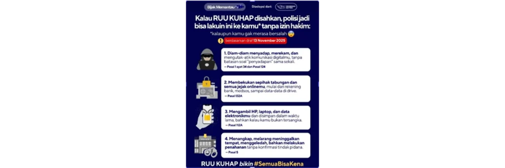 Setelah KUHAP baru disahkan, beredar berbagai poster dan potongan informasi di media sosial yang menyebut bahwa aturan tersebut memberi kewenangan luas kepada polisi dalam beberapa konteks berikut:
